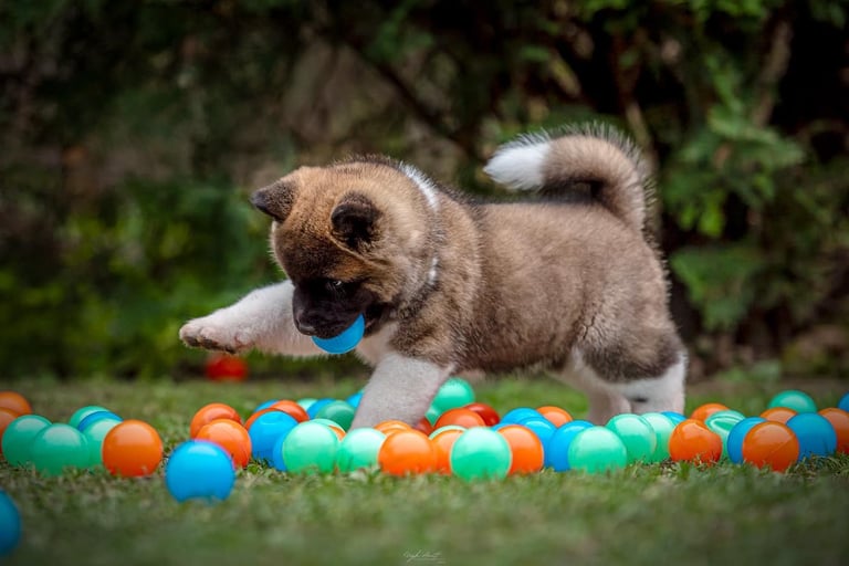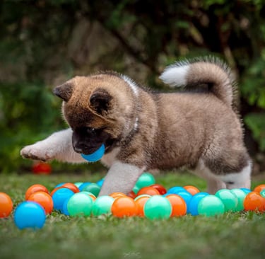 Los cachorros de Akita Americano suelen pasar los primeros meses de su vida en su propio mundo, y al igual que los bebés, suelen dormir la mayor parte del día. Se debe permitir al cachorro descansar y estar a solas siempre que lo desee. Generalmente a partir de los 6 meses de edad empiezan a mostrar afecto por su familia de una forma increíble; empiezan a " hablar " con su peculiar voz ronca de oso, sin duda se ganará el corazón de su familia en ese momento. Tienen una amplia variedad de rangos vocales, y a veces el dueño se sorprenderá de verse a sí mismo gruñendo a su cachorro en su propio idioma. Aunque los cachorros pueden ser realmente traviesos, su encanto lo supera todo.
